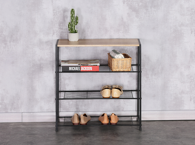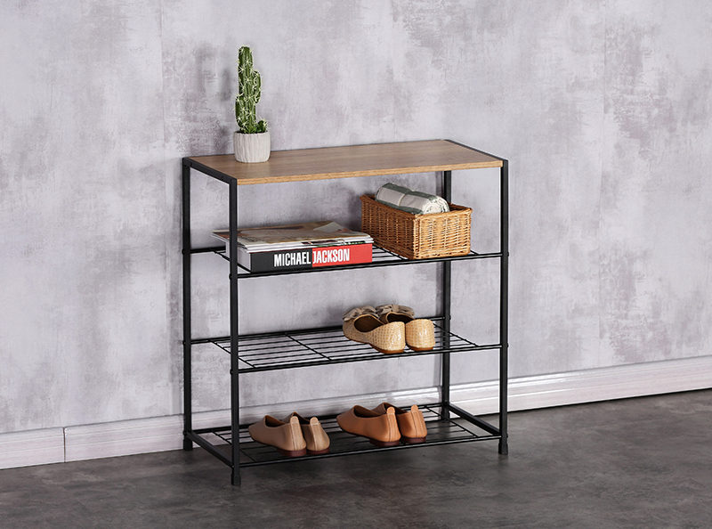 ◎Black Metal Shoe Rack with Wooden Top Plate